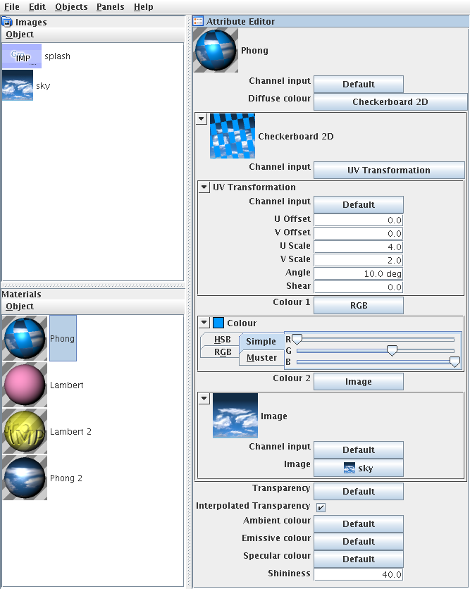 In the case of a Phong material (as depicted in the Figure below), attributes include: