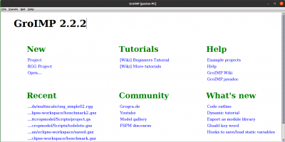 The main workbench serve as startup panel. It is opened automatically when GroIMP is started (even in UI without display). It was gray on older version of GroIMP, and is white with sections on newer versions. The main workbench remains “open” at all time as long as GroIMP is opened. When an other workbench is opened, the main workbench becomes “hidden”. It is visible again, when all other workbench are closed.