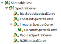 //user defined spectral curve, applied to an IrregularSpectralCurve float[] WAVELENGTHS = {380, 485, 490, 610, 615, 720}; float[] AMPLITUDES = {0,0,1,1,0,0}; ChannelSPD GREEN_SPD = new ChannelSPD(new IrregularSpectralCurve(WAVELENGTHS, AMPLITUDES)); //definition of a green SPD using a RGBSpectralCurve ChannelSPD GREEN_SPD = new ChannelSPD(new RGBSpectralCurve(0,1,0)); //a constant spectral curve of the intensity of 0.25 equally over the whole spectrum ChannelSPD CONST_SPD = new ChannelSPD(new ConstantSpectralCurve(0.25)); //a regular spectral curve will apply the given intensities over the specified range ([400,700]) ChannelSPD REG_SPD = new ChannelSPD(new RegularSpectralCurve(new float[] {0.1, 0.9,0.2,0.1,0.4}, 400, 700)); //a CIE Norm D55 spectral curve - sun light ChannelSPD REG_SPD = new ChannelSPD(new CIENormSpectralCurve(Attributes.CIE_NORM_D55)); // a black body spectral curve with a temperature of 5000K ChannelSPD REG_SPD = new ChannelSPD(new BlackbodySpectralCurve(5000));