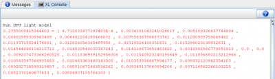 To obtain the measurement results, one needs to first run the light model and second check each (wanted) scene object for its absorption values. A simple graph query can eb used to implement the second part, where here is searched for all TestShader instances within the graph and the light absorption is obtained. Afterwards the results a printed to the GroIMP console window. The output of the code is the integrated absorbed power and the array of the absorption values for each bucket.