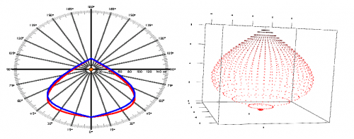 The physical light distribution can be defined as a polar distribution diagram (also called polar curve) showing the luminous intensity values with increasing angles from two imaginary axes of the lamp which is placed in the centre. Red: 0–180◦ plane, blue 90–270◦ plane. On the right of the Figure below, a 3D visualisation of the same light source is given. The colour of each point (gradient from black to bright red), as well as the distance to the light source, both indicate the power emitted by the light source in a particular direction per unit solid angle.