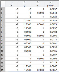 { float xi, yi, zi; } for (int x=0;x<6; x++) ( for (int y=0;y<6; y++) ( for (int z=0;z<3; z++) ( [ { xi =-2+0.75*x; yi =-2+0.75*y; zi =0.5*z; } Null(xi, yi, zi) SensorElement(xi, yi, zi) ] ) ) )