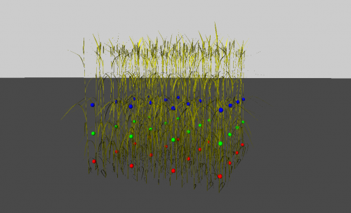 Here, a sensor grid is a 3D arrangement of SensorNodes, having a defined number of steps/nodes in x, y, and z direction. When placed within a canopy, such a sensor grid is ideal to measure light distributions within different layers of the canopy. Below an example of the light wheat canopy with three layers of sensor nodes (just for illustration reasons, each layer is coloured differently: from bottom to top, red, green, and blue).