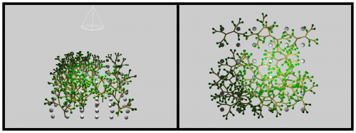 When integrated into a small canopy model of binary trees, the results may look like this (side and top view; Note: the Light source is not totally facing to the middle of the scene, but rather slightly sidewards to get some more interesting distribution pattern):