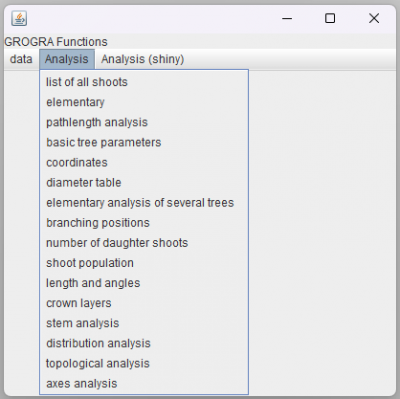 The functions are applied by clicking on their name in the <key>Analysis</key> drop-down menu. They all output a table that can be saved as e.g. .txt or .csv for further analysis in e.g. R via <key>data</key> → <key>exporttable</key>. The <key>Analysis (shiny)</key> menu provides the same functions and is supposed to somehow integrate with R, but I could not figure out how it works. Please add this info if you find it. This thesis provides some information on that but it did not really help me (under Windows).
