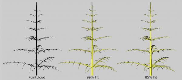The idea is to take a point cloud of a measured tree and 'move it over' it on the simulated tree to see how similar the tree and the measurements are. In the following, the point cloud (shown in the figure below) has been artificially created and therefore fits the tree very well.