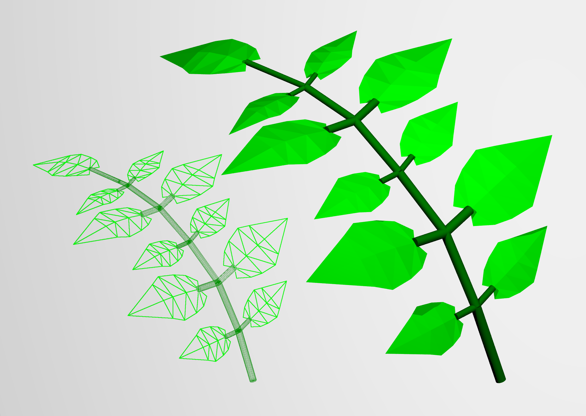 static MeshNode LeafletMesh; static { LeafletMesh = getMesh(vertexDataLeaflet); } protected void init() [ Axiom ==> Scale(0.007) LeafletMesh.(setShader(GREEN)); ]
