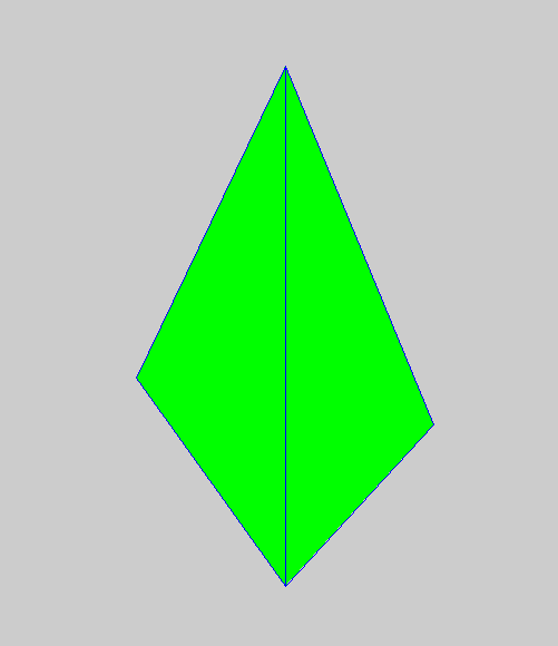import de.grogra.xl.util.IntList; import de.grogra.xl.util.FloatList; const float[] p0 = {0,0,0}; const float[] p1 = {-2.85,4,0}; const float[] p2 = {0,10,0}; const float[] p3 = {2.85,3.1,0}; const FloatList vertexDataLeaflet = new FloatList(new float[] { //left p0[0], p0[1], p0[2], p1[0], p1[1], p1[2], p2[0], p2[1], p2[2],//T1 //right p0[0], p0[1], p0[2], p2[0], p2[1], p2[2], p3[0], p3[1], p3[2]//T2 }); const PolygonMesh polygonMesh = new PolygonMesh(); static { int[] tmp = new int[vertexDataLeaflet.size()/3]; for(int i = 0; i<tmp.length; i++) tmp[i]=i; // set a list of the indices of the used list of vertices // normally = {0,1,2,3,...,n}, where n is the number of used vertices minus one polygonMesh.setIndexData(new IntList(tmp)); // set the list of vertices polygonMesh.setVertexData(vertexDataLeaflet); } protected void init() [ Axiom ==> Scale(0.007) MeshNode.(setPolygons(polygonMesh), setShader(GREEN)); ]