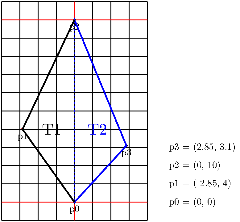 When connecting the points (P_0, P_1, P_2) and (P_1, P_3, P_2) we obtain two triangles. And by doing so, we already did our first (2D) triangulation. In computer graphics such a set of triangles - from now on called faces - is called mesh.