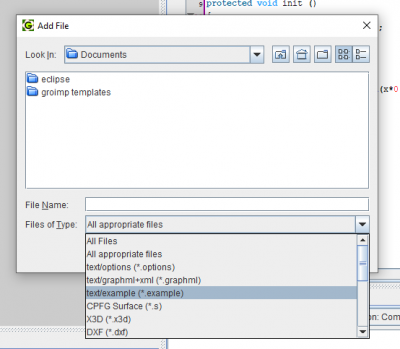 In GroIMP the filter is available. When adding a node from file you can see the “text/example” format: